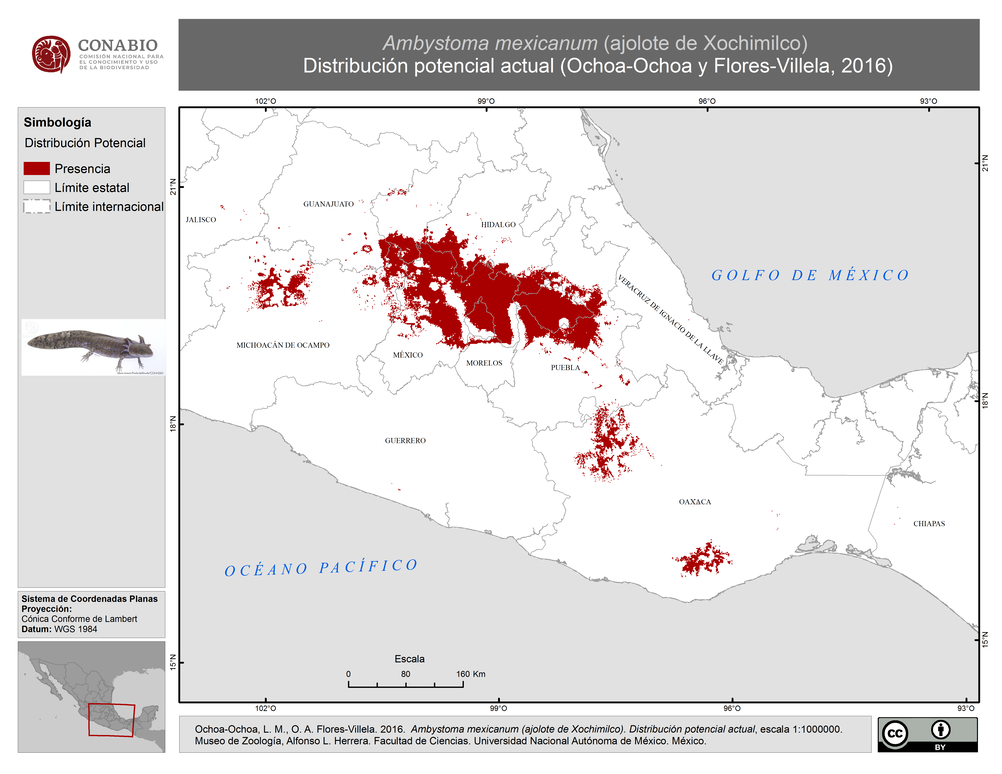- Ochoa-Ochoa, L. M., O. A. Flores-Villela, (2016). 'Ambystoma mexicanum (ajolote de Xochimilco). Distribución potencial actual.', escala: 1:1000000. edición: 2. Facultad de Ciencias, Universidad Nacional Autónoma de México. Proyecto: JM022, Anfibiofauna endémica frente al cambio climático: análisis de sensibilidad e incertidumbre. El Proyecto fue financiado por la Comisión Nacional para el Conocimiento y Uso de la Biodiversidad (CONABIO). Ciudad de México, México.
